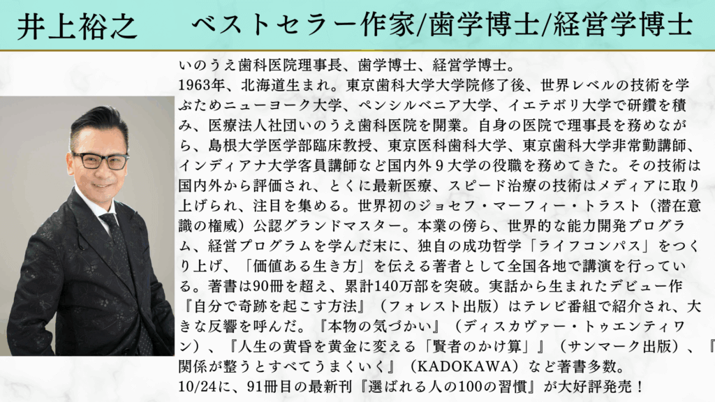 東京歯科大学大学院修了後、米国、スウェーデンで研鑽を積み、島根大学医学部臨床教授、東京医科歯科大学、東京歯科大学非常勤講師、インディアナ大学客員講師など国内外9大学の役職を務めてきた。最新医療とスピード治療で高い評価を受ける一方、世界初のジョセフ・マーフィー・トラスト公認グランドマスターを学んだ後、「ライフコンパス」を提唱し講演活動も行う。著書は累計140万部を超え、10月24日に91冊目の最新刊『選ばれる人の100の習慣』を発売、好評を得ている。