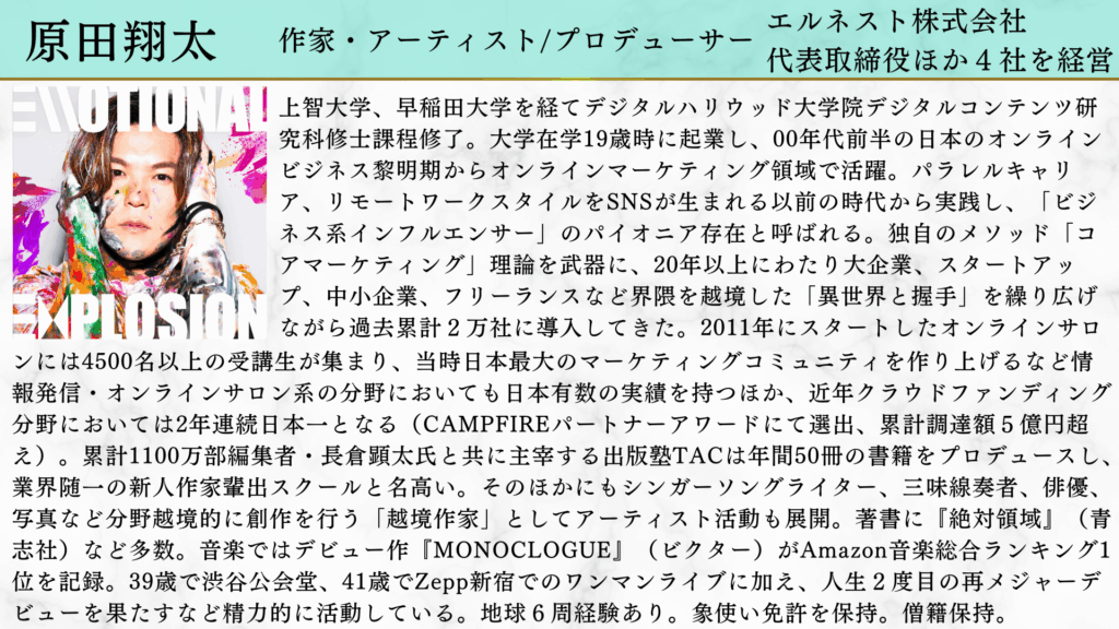 上智大学、早稲田大学を経てデジタルハリウッド大学院修了。19歳で起業し、日本のオンラインビジネス黎明期から活躍。「ビジネス系インフルエンサー」の先駆者として、4500名以上のオンラインサロン、累計2万社に独自メソッド「コアマーケティング」理論を導入。著書『絶対領域』など多数。音楽ではビクターよりメジャーデビューし、渋谷公会堂・Zepp新宿でワンマンライブを開催。象使い・僧籍免許を持ち、「異世界と握手」を繰り返し越境を続ける作家。