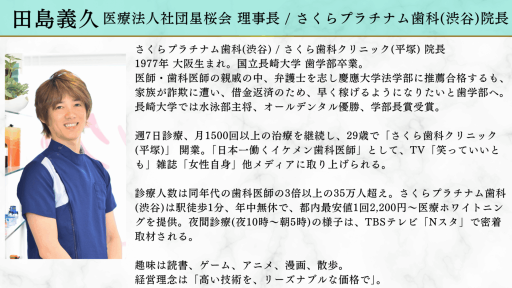 1977年大阪生まれ、長崎大学歯学部卒。週7日診療を続け、29歳で独立開業。これまでに延べ35万人以上を診療し、「日本一働くイケメン歯科医師」としてテレビや雑誌でも話題に。さくらプラチナム歯科渋谷院では都内最安値1回2,200円で医療ホワイトニングを行い、夜10時~翌朝5時の夜間診療は、TBS「Nスタ」で密着取材を受ける。理念は「高い技術を、リーズナブルな価格で」。