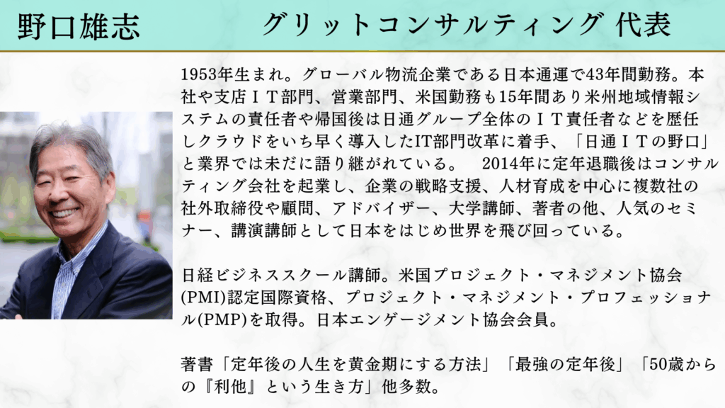 1953年生まれ。日本通運に43年間勤務し、アメリカの地域情報システム責任者や日通グループIT部門責任者としてクラウド導入を推進、「日通ITの野口」として名を馳せる。定年後はコンサル会社を設立、企業戦略支援・人材育成・講演活動を展開。日経ビジネススクール講師。PMP国際資格保持者。著書『定年後の人生を黄金期にする方法』『50歳からの『利他』という生き方』他多数。
