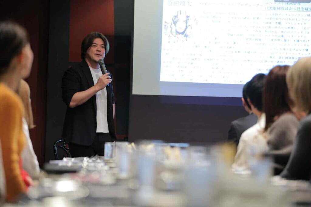 今回、ゆっくりとお食事をして頂きながらの会だったので、講演などそこまで長い時間は取れないことが始めからわかっていました。私自身が話していた時間はおそらく20分程度、ゲスト原田翔太さんとの対談も20分程度、でも、個人的にはものすごく濃厚なお話ができたのではないかと考えています。